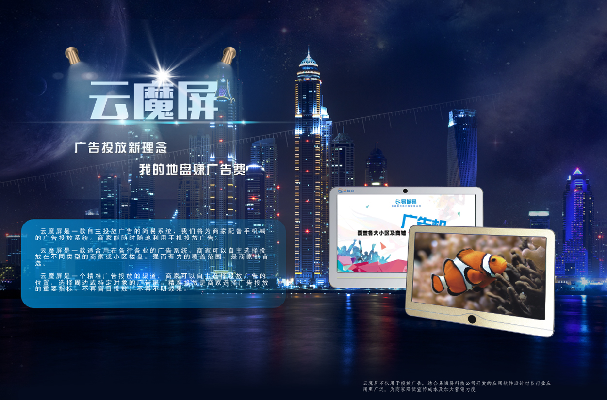 易城易云魔屏+是互聯(lián)網(wǎng)+傳媒+智能硬件與軟件的科技。專注打造“互動(dòng)媒體+廣告”的新媒體平臺(tái),以做為應(yīng)用場(chǎng)景,增加商家的宣傳價(jià)值、開(kāi)創(chuàng)互聯(lián)網(wǎng)互動(dòng)媒體新局面。